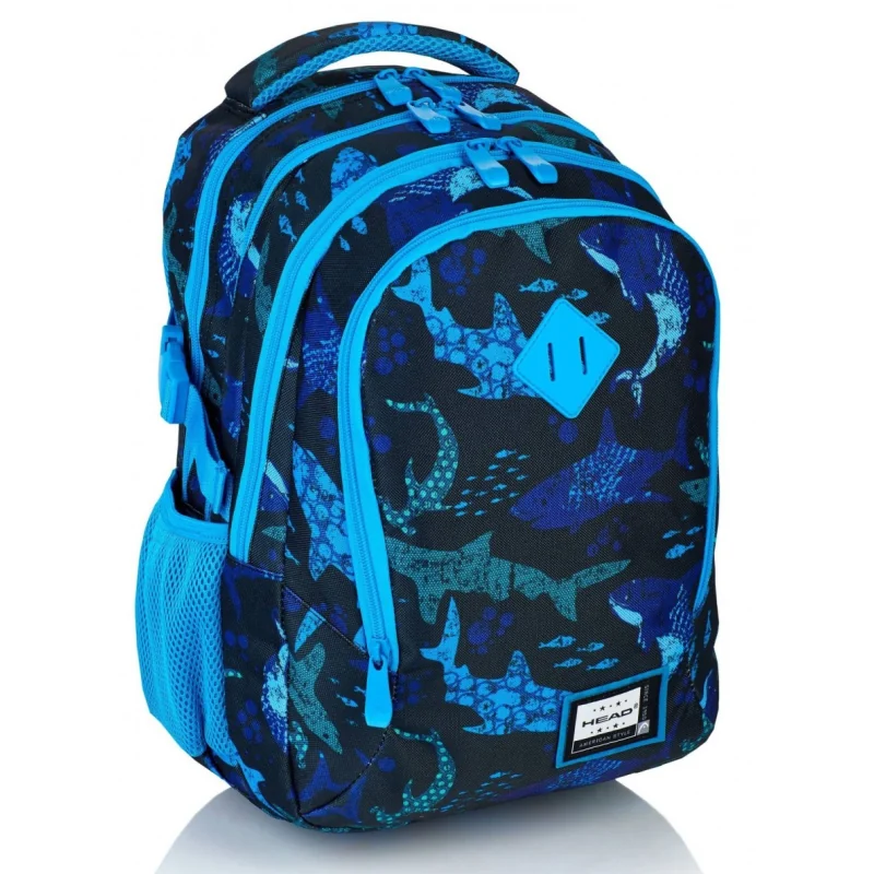 - niebieski plecak Head do klas 1-3 z motywem rekinów - idealny na dobry start w szkole. Te same nowoczesne udogodnienia co w plecakach młodzieżowych HEAD.