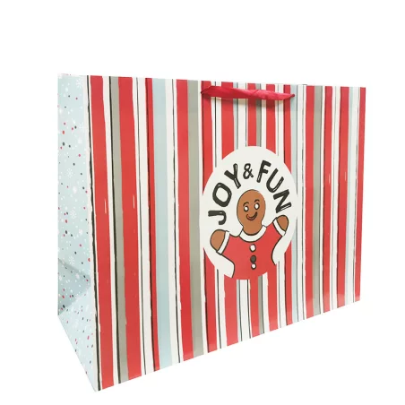 - ozdobiona wzorem w piernikowego ludzika z napisem "Joy & Fun", z tłem w paski