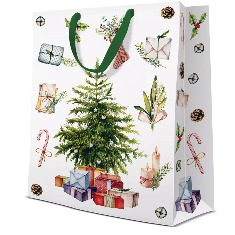 Dodaj magii do swojego podarunku dzięki tej eleganckiej torebce prezentowej o świątecznym charakterze! Idealna do zapakowania prezentów dla bliskich – bez konieczności używania papieru i taśmy. Torebka ozdobiona motywami bożonarodzeniowymi (np. choinki, śnieżynki, renifery, złote akcenty) wprowadza w wyjątkowy klimat świąt.