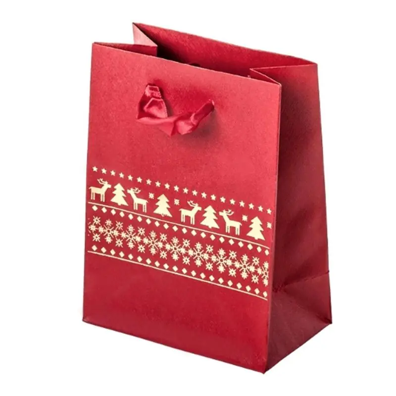 Dodaj magii do swojego podarunku dzięki tej eleganckiej torebce prezentowej o świątecznym charakterze! Idealna do zapakowania prezentów dla bliskich – bez konieczności używania papieru i taśmy. Torebka ozdobiona motywami bożonarodzeniowymi (np. choinki, śnieżynki, renifery, złote akcenty) wprowadza w wyjątkowy klimat świąt.