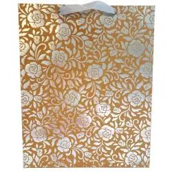 Torebka ozdobna prezentowa Róże Metalik 31x42x12cm to eleganckie i trwałe opakowanie, które podkreśli wyjątkowość każdego prezentu. Wytrzymały papier, dekoracyjny wzór oraz praktyczny rozmiar sprawiają, że to doskonały wybór na każdą okazję.