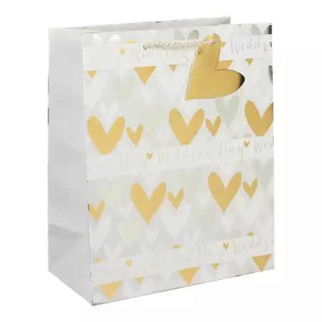prezentowa w kształcie serca na dzień ślubu Ta duża torba na prezent jest idealna do prezentowania prezentu ślubnego. Projekt zawiera napis Wedding Day w metalicznej srebrnej czcionce z metalicznymi złotymi, srebrnymi i białymi sercami, które mienią się na miękkim szarym tle. U góry torebka ma kremowe uchwyty ze sznurka, z dopasowaną