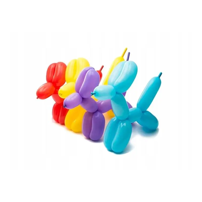 Zestaw balonów modelinowych w różnych kolorach, w zestawie z pompką. Długie balony w kształcie rurek przeznaczone do modelowania. Za pomocą balonów modelinowych można wykonać wiele kształtów i dekoracji. Niezbędne w pracy animatorów i dekoratorów przyjęć. Po napompowaniu balon o wymiarach: 5 cm średnica, 140 cm długość. W opakowaniu