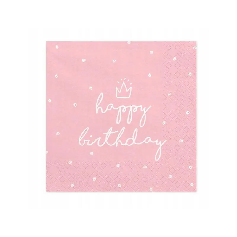 Serwetki papierowe HAPPY BIRTHDAY różowe PARTY DECO to estetyczny i funkcjonalny element dekoracji stołu na przyjęcie urodzinowe. Delikatna kolorystyka oraz czytelny nadruk sprawiają, że produkt doskonale wpisuje się w aranżacje dziecięce, młodzieżowe i rodzinne, podkreślając wyjątkowy