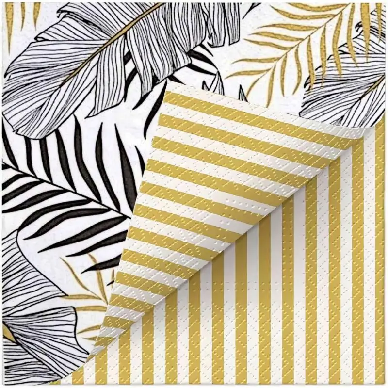 Serwetki papierowe dwustronne PAW łączą praktyczność z elegancją. Dwustronny nadruk liści oraz złote paski dodają wyjątkowego stylu i tropikalnego charakteru, sprawiając, że każdy stół wygląda atrakcyjnie, a jednocześnie serwetki są łatwe w użyciu i ekologiczne.
