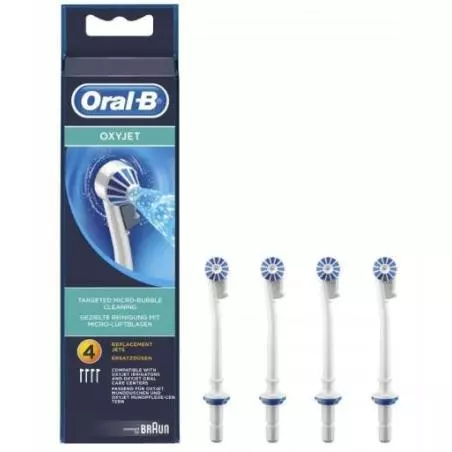 Końcówka Oral B Jets: 4 wymienne dysze do irygatora Oral-B, Strumień pojedynczy (mono) do wypłukiwania resztek jedzenia, Prysznic (multi) do kompletnej higieny jamy ustnej, Pasują do modeli: Professional Care 8500 Oral Care Center i irygatora Professional Care 8500 OxyJet (OC17 i MD17). Pasują również do modeli: MD15 i OC15.