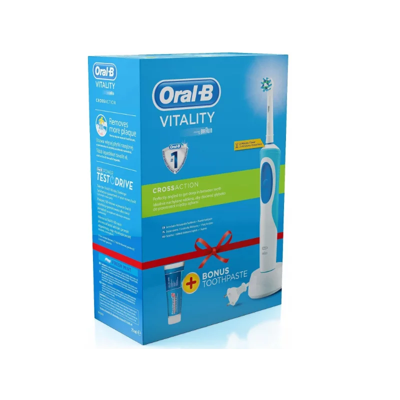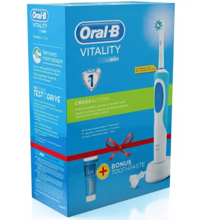 Jak dowodzą badania kliniczne, szczoteczka akumulatorowa Oral-B Vitality CrossAction czyści zęby skuteczniej niż zwykła szczoteczka manualna. Końcówka szczoteczki CrossAction dokładnie otacza każdy ząb włóknami nachylonymi pod kątem 16 ,stopni i ,czyści, wykorzystując technologię 2D opartą na dwóch rodzajach ruchów: oscylacyjnych i ,rotacyjnych. Dzięki temu usuwa więcej płytki nazębnej niż zwykła szczoteczka manualna. Timer wbudowany w rączkę szczoteczki pomaga zachować zalecany przez dentystów 2-minutowy czas mycia zębów. A co najlepsze, szczoteczka ta została stworzona przez Oral-B, markę nr 1 wśród szczoteczek elektrycznych używanych przez dentystów na całym świecie. Opakowanie zawiera dodatkowo pastę do zębów Blend-a-med Pro-Expert. Pasuje do wymienionych poniżej końcówek wymiennych do szczoteczek elektrycznych: CrossAction, 3D White, Sensitive Clean, Precision Clean, FlossAction, TriZone oraz Dual Clean.