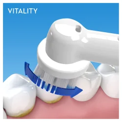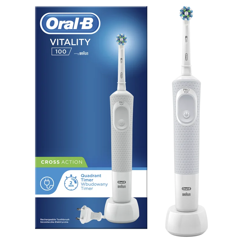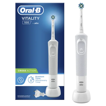 Oral-B Vitality 100 Cross Action to szczoteczka elektryczna stworzona dla osób, które chcą skuteczniej dbać o higienę jamy ustnej. Udowodniono klinicznie, że czyści zęby i przestrzenie międzyzębowe dokładniej niż tradycyjna szczoteczka manualna. Dzięki okrągłej końcówce oraz technologii 2D (oscylacyjno-rotacyjnej) usuwa więcej płytki nazębnej i pozwala utrzymać zęby w lepszej kondycji.