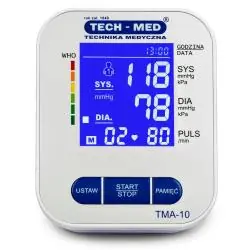 Ciśnieniomierz elektroniczny TECH-MED TMA-10 to nowoczesny ciśnieniomierz naramienny przeznaczony do wygodnego, codziennego pomiaru ciśnienia krwi i tętna w warunkach domowych. Urządzenie łączy prostą obsługę, czytelny podświetlany ekran LCD oraz funkcje ułatwiające regularną kontrolę wyników, takie jak wykrywanie arytmii, pamięć pomiarów