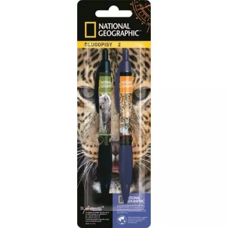 Długopis automatyczny z licencyjnym motywem graficznym NATIONAL GEOGRAPHIC. Posiada wymienny wkład w kolorze niebieskim. Komfort pisania zapewnia gumowy grip zapobiegający wysuwaniu się długopisu z dłoni w trakcie użytkowania. Długopisy dostępne są w zestawach po 2 sztuki na blistrze.