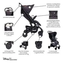 To spacerówka stworzona z myślą o mobilności – sprawdzi się w podróży samolotem, podczas miejskich spacerów i codziennych zakupów. Dzięki autoblokadzie po złożeniu wózek stoi samodzielnie, a aluminiowy stelaż gwarantuje trwałość przy zachowaniu maksymalnej lekkości. Wysoka jakość materiałów oraz licencjonowany motyw Disney wyróżniają ten model na tle klasycznych wózków.