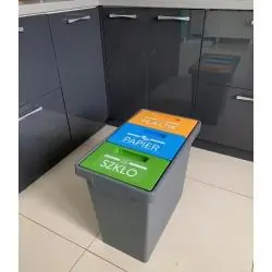 Potrójny kosz do segregacji 40 L to praktyczne rozwiązanie dla osób, które chcą w łatwy i estetyczny sposób dbać o środowisko. Trzy osobne komory – żółta na plastik, zielona na szkło i niebieska na papier – umożliwiają wygodne sortowanie odpadów w jednym kompaktowym pojemniku.