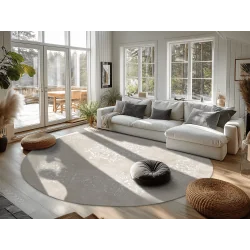 Dywan Santi sprawdzi się przede wszystkim w salonie, gdzie może stać się centralnym elementem aranżacji – pod stolikiem kawowym, w strefie wypoczynkowej lub w otwartej przestrzeni dziennej. Okrągły kształt pomaga „zmiękczyć” układ mebli i przełamać proste linie, a beżowo-białe barwy wprowadzają jasność i przytulność bez przytłaczania wnętrza.