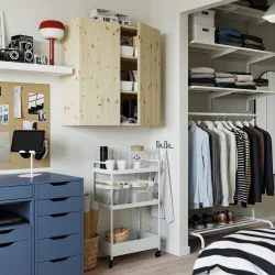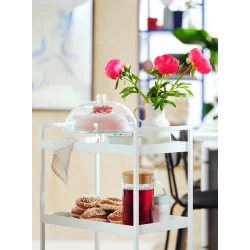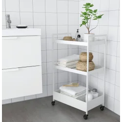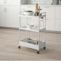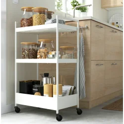 Wózek IKEA NISSAFORS sprawdzi się jako dodatkowy pomocnik w kuchni, mobilny regał w łazience, praktyczny organizer w przedpokoju lub stolik nocny w sypialni. To dobry wybór do przechowywania kosmetyków, akcesoriów kuchennych, środków czystości, książek, dokumentów czy dekoracji. Dzięki mobilnej konstrukcji można łatwo dostosować jego położenie do aktualnych potrzeb i lepiej wykorzystać dostępną przestrzeń w domu.