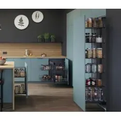 System REJS Corner Comfort został stworzony do zagospodarowania narożnych szafek kuchennych, w których standardowy dostęp do przechowywanych rzeczy jest utrudniony. Doskonale sprawdzi się do przechowywania garnków, patelni, zapasów spożywczych, pojemników i innych akcesoriów kuchennych. Dzięki wysuwanym półkom pozwala lepiej uporządkować wnętrze szafki i zwiększyć komfort codziennego korzystania z kuchni.