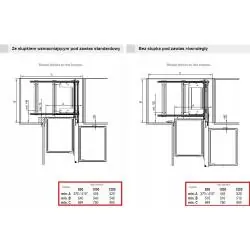 Model jest przeznaczony do szafek narożnych o minimalnej szerokości wewnętrznej 664 mm, wysokości 654 mm i odpowiedniej głębokości montażowej.