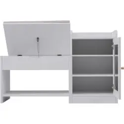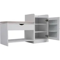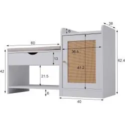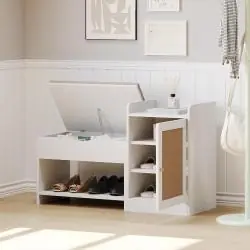Ławka na buty z rattanu ze schowkiem i drzwiczkami to praktyczny i estetyczny mebel do przedpokoju, garderoby lub sypialni, który pomaga uporządkować obuwie i drobne akcesoria. Połączenie białej konstrukcji z dekoracyjnymi frontami w stylu rattanu tworzy przytulny, naturalny wygląd, który dobrze wpisuje się w nowoczesne, skandynawskie i boho wnętrza. To funkcjonalna szafka na buty z siedziskiem, która łączy wygodę codziennego użytkowania z dodatkową przestrzenią do przechowywania.