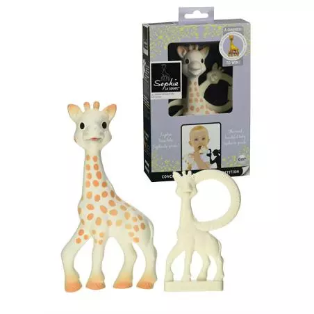 - klasyczny gryzak Żyrafa Sophie, o wysokości ok. 18 cm., wykonany w 100% z lateksu – z żywicy drzewa gumowego. Naturalne tworzywo, pokryte farbą spożywczą, jest bezpieczne do żucia, lekkie i elastyczne, co chroni przed bolesnymi urazami podczas machania. Obłe kształty są łatwe do uchwycenia dla małej rączki. Gryzak stymuluje i rozwija 5 zmysłów : wzrok – kontrastowe cętki, słuch – piszczałka umieszczona w brzuchu, dotyk – specyficzny dotyk kauczuku, gładki jak skóra mamy, zapach – szczególny zapach naturalnej gumy, pozwalający odróżnić gryzak w stosie innych zabawek, smak – główny zmysł poznawczy maluszka. Doskonałe remedium na ząbkowanie;