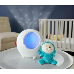 Wprowadź kojący i łagodny nastrój przy pomocy uspokajacza i mięciutkiego misia z zestawu Gwiezdny Projektor. Ma on wiele funkcji, m.in. świetlną projekcję gwiazdek, zmieniającą kolor lampkę nocną oraz różnorodne dźwięki i muzykę, by łatwo można było