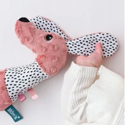 Mięciutki, materiałowy piszczek w formie pieska z gryzakiem i szeleszczącymi uszkami.