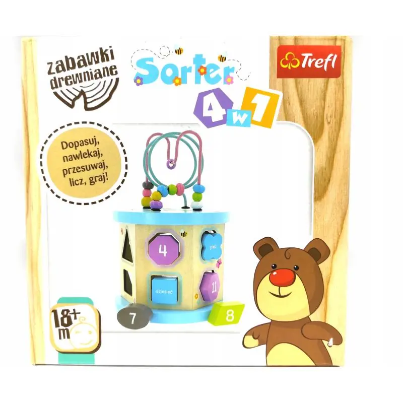 Sorter 4 w 1 to wielofunkcyjna zabawka ogólnorozwojowa do nauki kształtów, kolorów oraz cyfr.