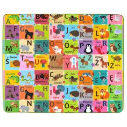Kolorowa strona maty służy do nauki liter alfabetu na przykładzie nazw sympatycznych zwierzątek. Alfabet uwzględnia wszystkie polskie litery, a zwierzątka z różnych zakątków świata na pewno rozbudzą ciekawość dziecka i staną się elementem wspólnej edukacyjnej zabawy.