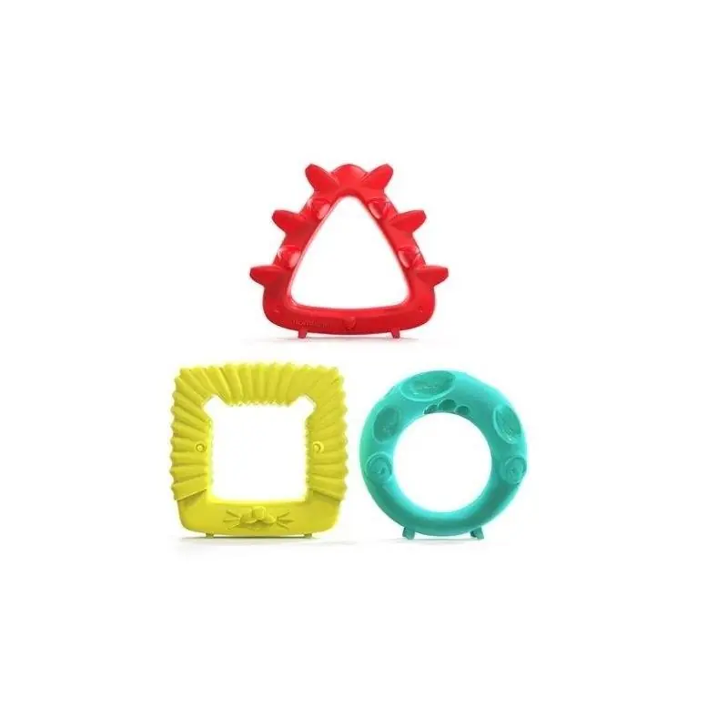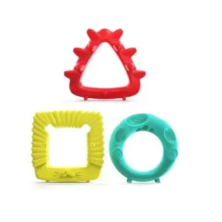 Mombella Geometryczny Gryzak Silikonowy to zestaw 3 uroczych, miękkich i bezpiecznych gryzaków – Jeż, Owieczka i Lew – zaprojektowanych z myślą o stymulacji zmysłów dziecka i łagodzeniu bólu dziąseł podczas ząbkowania.