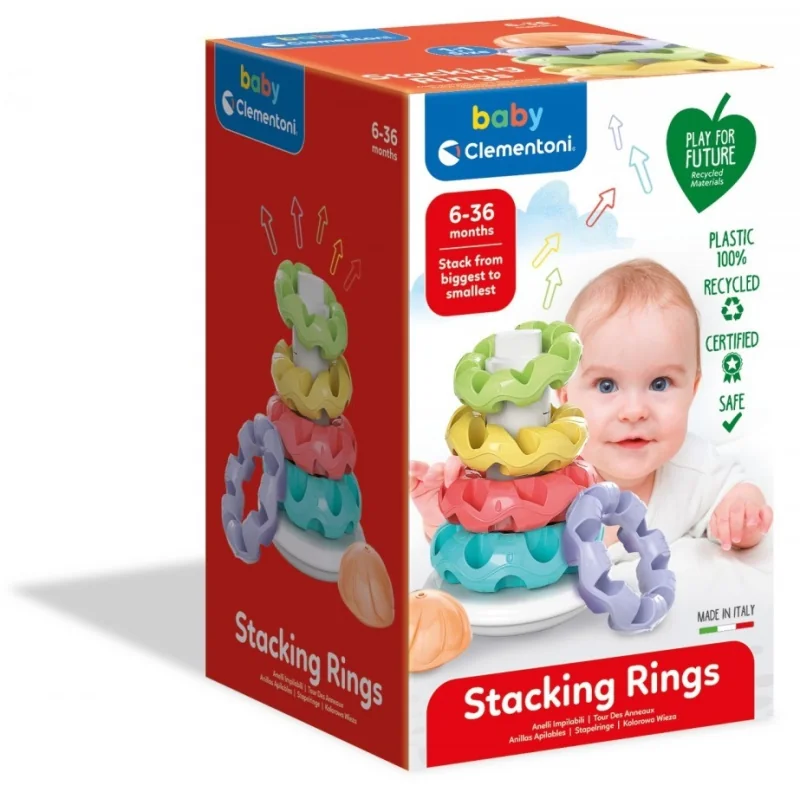 • 5 kolorowych pierścieni różnych rozmiarów, które można ułożyć w wieżę.