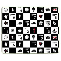 Strona z kontrastową kolorystyką o wzorze szachownicy jest idealna dla niemowląt od pierwszych dni ich życia. Ułatwia naukę spostrzegania i wspomaga kształtowanie inteligencji wizualno-przestrzennej. Kontrastowe czarno-białe obrazki o prostych wzorach - urozmaicone czerwonymi elementami - z pewnością zwrócą uwagę dziecka.
