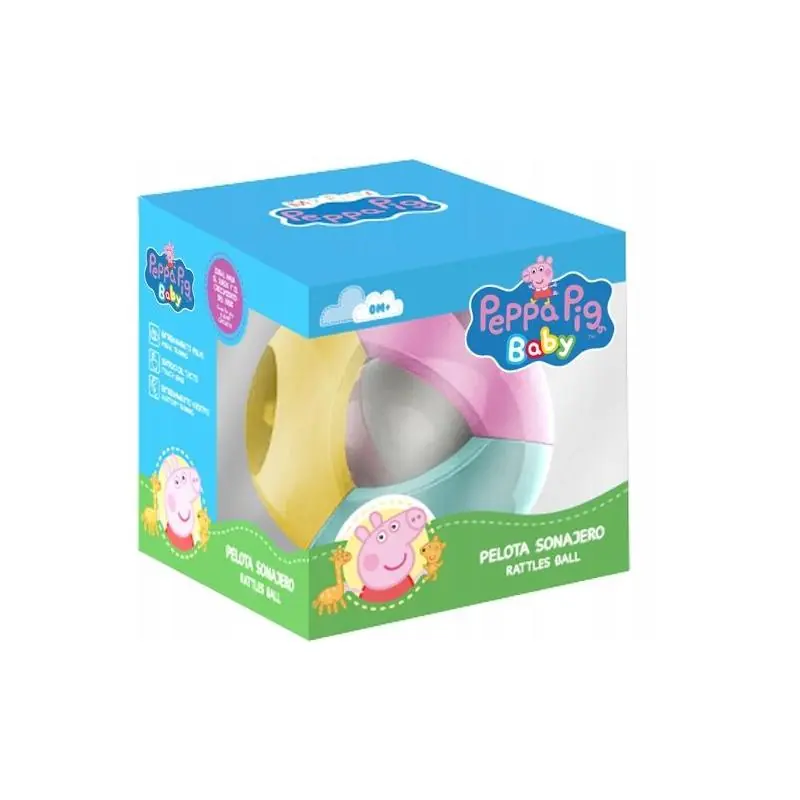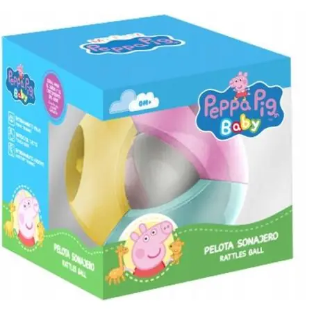 Piłka grzechotka Peppa Pig Kids Euroswan to lekka, miękka i bezpieczna zabawka sensoryczna inspirowana popularną bajką Peppa Pig. Stworzona z myślą o najmłodszych, wspiera rozwój ruchowy i koordynację, a delikatny dźwięk grzechotki zachęca dziecko do aktywnej zabawy.