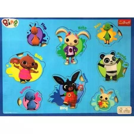 Kolorowe ilustrowane drewniane puzzle z motywem z ulubionej bajki BING. Drewniana łamigłówka dla dzieci w wieku 18m+. Idealne połączenie nauki i zabawy. Dopasuj kształty swoich ulubionych bohaterów.