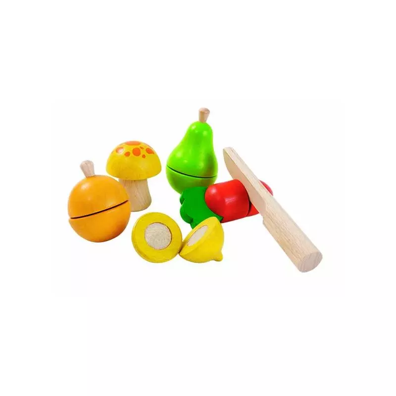 Zestaw zawiera pomarańczę, cytrynę, gruszkę, marchewkę, grzybek oraz bezpieczny nożyk.