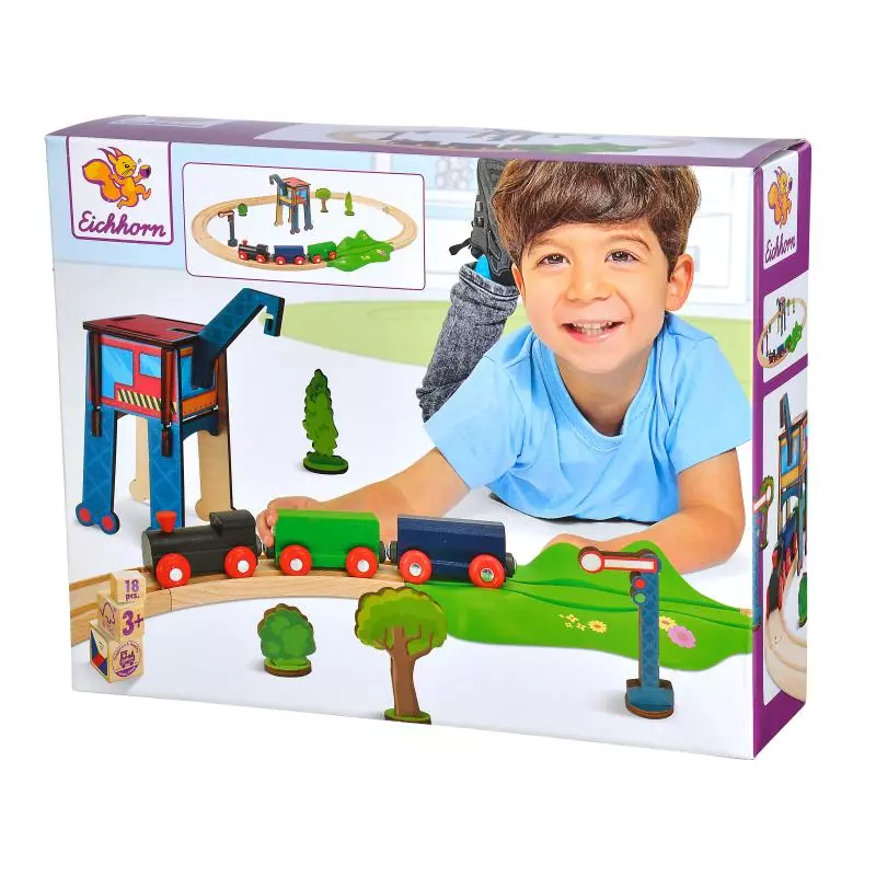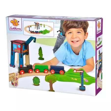 Drewniana ciuchcia z dwoma wagonami, tor okrężny z zakrętami, dodatkowo zestaw dźwigowy, akcesoria.
