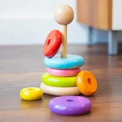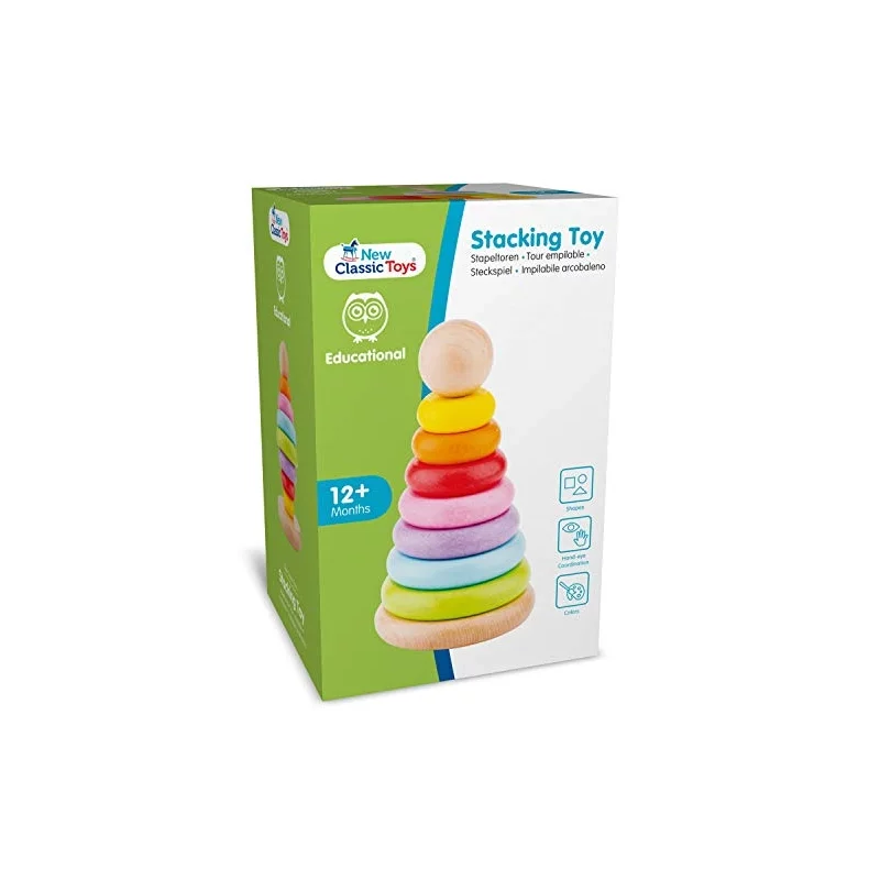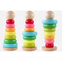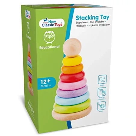Tęczowa wieża do układania z New Classic Toys jest wykonana z drewna bukowego i posiada 7 kolorowych pierścieni. Ulubieniec wśród wielu dzieci. Drewniane pierścienie są łatwe do chwytania. Jednocześnie ćwiczą koordynację wzrokowo-ruchową dziecka i rozpoznawanie kolorów. Bardzo pouczający jest również koncept „mniejszego” i