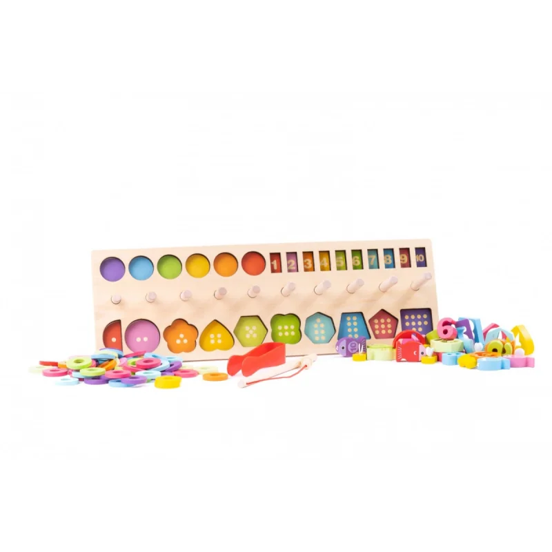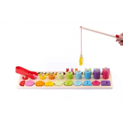Wielość elementów w tej drewnianej układance daje szerokie możliwości sposobu zabawy. Na początek, maluch może zacząć od przekładania elementów paluszkami następnie, aby podnieść poziom trudności, może spróbować użyć dołączonych szczypczyków, których używanie wpłynie również na rozwój koordynacji ruchowej dziecka. Kolejnym krokiem dla podniesienia trudności, będzie obsługa wędki z magnesem, którym można podnosić i przenosić elementy. Zabawa układanką pozwoli najmłodszym na rozwijanie ruchów precyzyjnych przy układaniu elementów we właściwych miejscach. Dla nieco starszego dziecka będzie natomiast nieocenioną pomocą przy nauce liczenia.