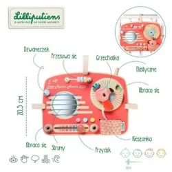 Drewniana tablica manipulacyjna Radio Flaming Anais 9m+ to wyjątkowa zabawka sensoryczna, zaprojektowana z myślą o najmłodszych dzieciach. Wykonana z bezpiecznego, naturalnego drewna i ozdobiona pastelowymi kolorami, zachęca malucha do odkrywania, naciskania,