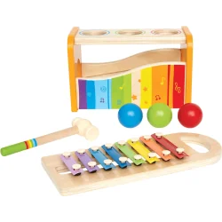 Ksylofon Hape Pound and Tap Bench to drewniana zabawka muzyczna przeznaczona dla dzieci od 12 miesiąca życia. Łączy w sobie funkcję ksylofonu i stolika z piłeczkami, które po uderzeniu młotkiem spadają na metalowe płytki, wydając przyjemne dźwięki.