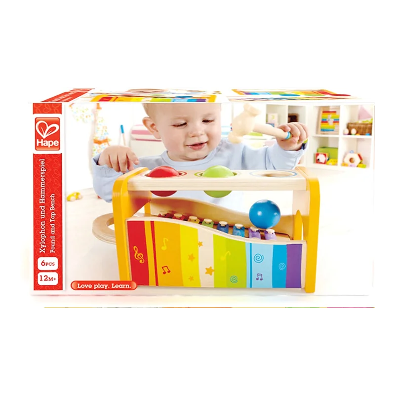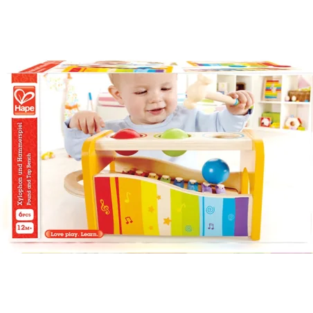 Ksylofon Hape Pound and Tap Bench to drewniana zabawka muzyczna przeznaczona dla dzieci od 12 miesiąca życia. Łączy w sobie funkcję ksylofonu i stolika z piłeczkami, które po uderzeniu młotkiem spadają na metalowe płytki, wydając przyjemne