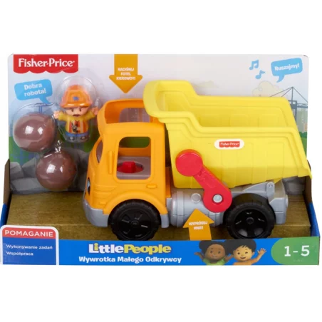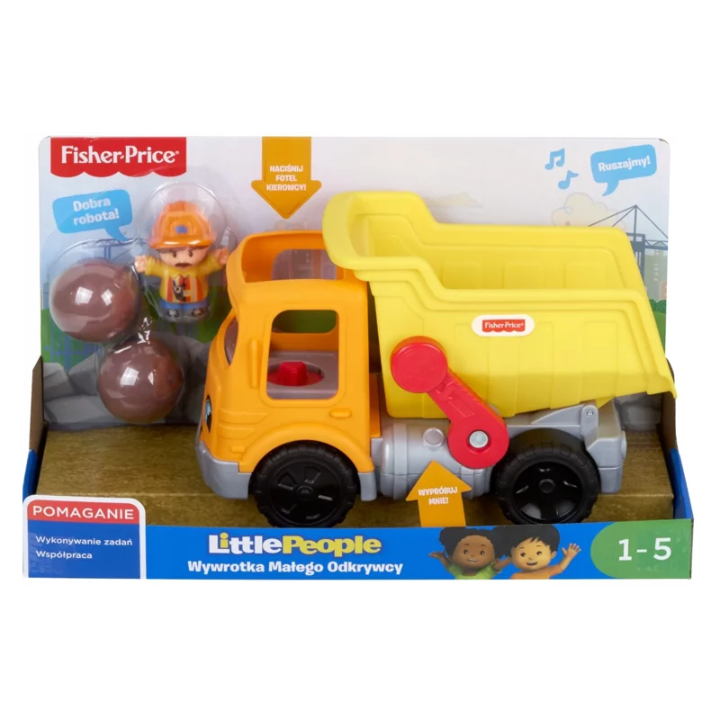 Zabierzmy się do pracy! Dzieci mogą odgrywać mnóstwo wesołych historii z wywrotką Little People. Twój mały budowniczy może załadować „głazy”, przewieźć je w inne miejsce i wyładować - a wszystko to przy wesołych wypowiedziach, piosenkach i dźwiękach!