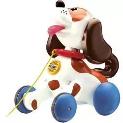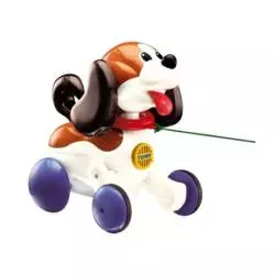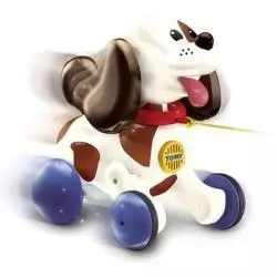 Muzyczny spacer z pieskiem dostarczy nie lada frajdy każdemu smykowi! Jest naprawdę uroczy! Wesoła, słodka minka, wyciągnięty języczek i wielkie, radosne oczka, sprawiają, że każdy maluszek natychmiast chce się z nim zaprzyjaźnić. Łaciaty, biało -brązowy spryciarz, odwdzięczy się za to wesołą i zajmującą zabawą przez długie chwile. Idziemy na spacer! Na szyi pieska jest zamocowana specjalna, czerwona obroża, a do niej przywiązana żółta smycz. Kiedy maluszek pociągnie pupila, ten zaczyna wydawać wesołe dźwięki, szczeka, a jego długie uszka poruszają się w rytm spaceru. Dzięki niebieskim kółeczkom zamocowanym na łapkach zabawki, piesek porusza się w dowolnym tempie nadanym przez Pana. Plastikowe kółka zabezpieczone są gumowymi podkładkami, dzięki którym łaciaty pupil może bezpiecznie jeździć po różnego rodzaju powierzchniach, zarówno w domu jak i na zewnątrz. Nasz piesek jest bardzo mądry! Kiedy smyk przestaje ciągnąć przyjaciela, ten siada, a kiedy jest zostawiony na dłużej smutno skamle, prosząc tym samym o zainteresowanie.