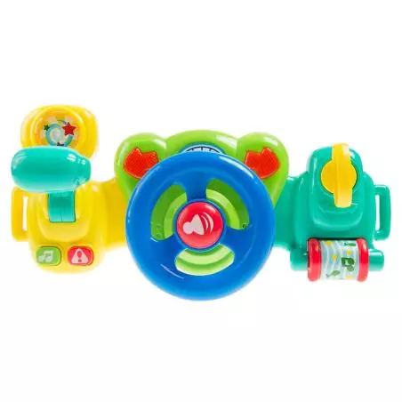 - Zabawka zawiera wiele elementów imitujących prawdziwy samochód: dźwignię zmiany biegów, klakson czy przycisk włączający światła awaryjne. Dodatkowo gra zabawne melodie.