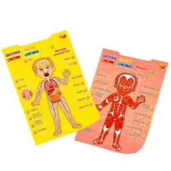Zestaw umożliwia poznanie budowy człowieka krok po kroku – od ogólnej sylwetki, przez mięśnie i narządy wewnętrzne, aż po szkielet. Interaktywna forma zachęca dziecko do samodzielnego odkrywania i utrwalania wiedzy.