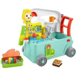 Fisher-Price Ucz się i śmiej! Wesoły Kamper Malucha to interaktywne centrum zabaw i pchacz, które rośnie razem z dzieckiem – od zabawy na siedząco, przez pierwsze kroki, aż po kreatywne odgrywanie biwakowych historii. Dzięki 3 Poziomom nauki oraz bogatej bazie ponad 100 piosenek, dźwięków, melodii i wypowiedzi w języku polskim, zabawka wspiera