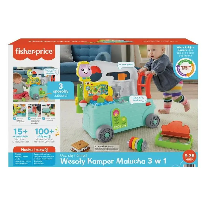 Fisher-Price Ucz się i śmiej! Wesoły Kamper Malucha to interaktywne centrum zabaw i pchacz, które rośnie razem z dzieckiem – od zabawy na siedząco, przez pierwsze kroki, aż po kreatywne odgrywanie biwakowych historii. Dzięki 3 Poziomom nauki oraz bogatej bazie ponad 100 piosenek, dźwięków, melodii i wypowiedzi w języku polskim, zabawka wspiera rozwój poznawczy, ruchowy i językowy dzieci w wieku od 9 do 36 miesięcy.