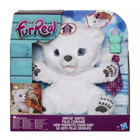Ten uroczy miś polarny potrzebuje wiele czułości! Lekko naciśnij plecki misia, aby poruszył główką, zamknął oczy i wydał z siebie urocze dźwięki. Gdy pogłaszczesz go po głowie - zamknie i otworzy oczka, a gdy połaskoczesz go po nosie, wówczas wyda radosne dźwięki i kichnięcia. Gdy zwierzaczek zgłodnieje, nakarm go buteleczką i ułóż do spania, używając specjalnego kocyka. W zestawie Miś Polarny, buteleczka do karmienia oraz kocyk.