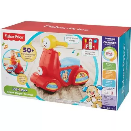 Wesoła, aktywna zabawa z ponad 50 dźwiękami, piosenkami do wspólnego śpiewania, melodyjkami i wypowiedziami w języku polskim! Skuter „Ucz się i śmiej!” z technologią „Poziomy nauki” pomaga w rozwoju sprawności ruchowej. Podczas „jazdy” dziecko jest nagradzane uroczymi komunikatami, efektami dźwiękowymi i piosenkami. Kiedy dziecko naciśnie działający klakson, w nagrodę posłucha kolejnych piosenek i efektów dźwiękowych. Naciskając przyciski na desce rozdzielczej, może poznawać liczby, kształty, kolory i nie tylko! Jest tu nawet klikający kluczyk, który zachęca dziecko siedzące na miejscu kierowcy do zabawy w odgrywanie ról! Skuter z trzema poziomami zabawy zmieniającymi się wraz z wiekiem dziecka zapewnia maluszkowi zabawę na wielu etapach rozwoju.