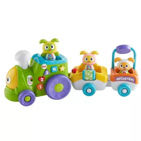 Interaktywna zabawka Pociąg BeBo od Fisher-Price z wesołymi postaciami na pokładzie zachęca dziecko do zabawy, nauki i raczkowania! Dołącz do BeBo, Belli i ich pieska. Twój mały konduktor naciska podświetlany komin, a pociąg rusza naprzód i odtwarza wesołą muzykę oraz wypowiedzi na temat alfabetu, kolorów, kształtów i nie tylko! Zabawka wykorzystuje też technologię „Poziomy nauki”, więc treści edukacyjne można dostosować do wieku i etapu rozwoju dziecka!