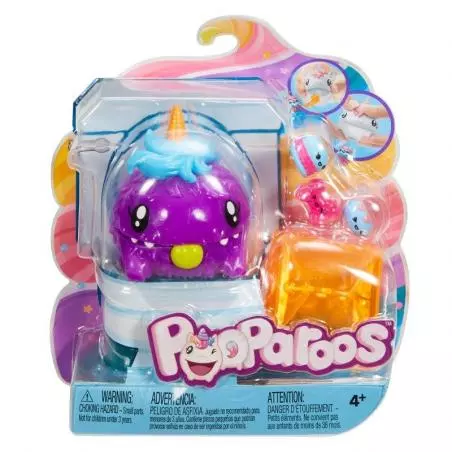 Pooparoos to szalone figurki, które uwielbiają jeść, a następnie korzystać z toalety! Robią to bez końca, a przy tym są wyjątkowo sympatyczne. Wybierz jednego ze zwierzaków - króliczka, świnkę czy pieska, albo zdecyduj się na magiczną postać - smoka, potworka lub jednorożca. Do każdego stworka dołączona została paka 3 jedzonek oraz tacę do ich serwowania. Nakarm swojego przyjaciela, następnie ściskaj jego głowę i obserwuj jak maluch zaczyna się wypróżniać. Zwierzątka mogą służyć również jako ozdoba dla twojego ołówka czy długopisu. W asortymencie dostępnych jest 8 postaci - zbierz je wszystkie i stwórz wyjątkową drużynę Pooparoos!