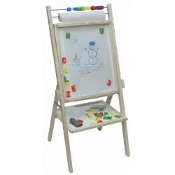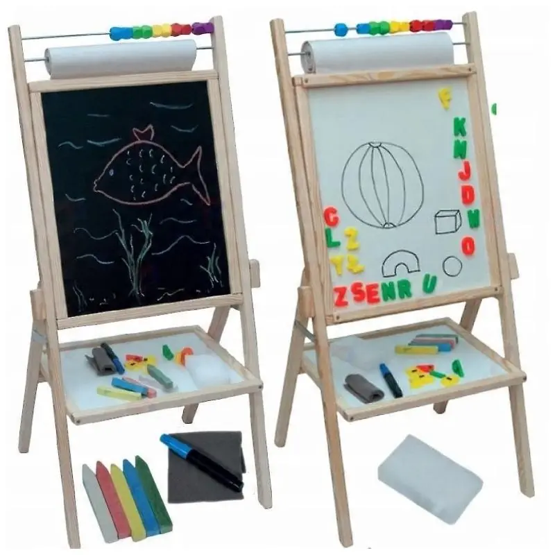 Duża, drewniana tablica edukacyjna to wszechstronna pomoc dydaktyczna, która łączy aż 5 funkcji w jednym produkcie. Tablica oferuje dwustronną powierzchnię: jedna strona służy do pisania markerem suchościeralnym, druga to klasyczna tablica kredowa. Dodatkowo wyposażona jest w liczydło z kolorowymi koralikami oraz rolkę papieru o długości 10 metrów, idealną do rysowania lub ćwiczenia pisania.