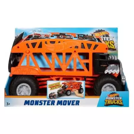 Dzięki temu dużemu transporterowi możesz przewozić nawet 12 pojazdów Hot Wheels® Monster Trucks i posyłać je w drogę, wypuszczając z tylnej rampy jednym przyciskiem!